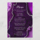 Display your meal selections in style with this elegant wedding menu featuring a purple agate marble design accented with silver details. The geode-inspired background creates a sophisticated look, perfect for fall and winter weddings, formal celebrations, or evening events. Designed to coordinate with your wedding stationery suite, this menu is ideal for presenting courses clearly while adding a luxurious touch to your table setting. The clean typography ensures readability while complementing the agate texture. Easily personalise all text to suit your menu and event details, making it a beautiful choice not only for weddings but also for engagement parties, anniversaries, and other formal occasions.