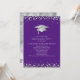 This modern design features a graduation hat and confetti in silver on a background of purple with white text.