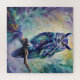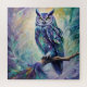 A fabulous owl with purple and teal feathers perches on a branch with purple, green, and teal fantasy foliage behind him. Gorgeous image, perfect for anyone who loves owls, magic, and fantasy.