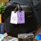 Painting of purple and white stars on a blended lavender background, with Mrs. printed on the front of luggage tags. There is a placeholder for the name and address on the back.