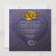 Dark purple damask background with rich purple and yellow roses with sprigs of gold baby's breath and a deep purple ribbon in a heart-shaped frame. Perfect for a handfesting, wiccan, pagan, or celtic ceremony. Easy to personalise with your own information. If you would like this design on a matching product, please email me at shutterbug600@yahoo.com. Please be sure to include the link to this invitation in your correspondence.