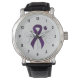 Purple ribbon with a butterfly, concentric circles, and swishes. Wearing the ribbon in February for Macular Degeneration Awareness. In April for Animal Abuse Awareness, Sarcoidosis Awareness, Sjogren's Syndrome Awareness, Testicular Cancer. May for Cystic Fibrosis Awareness, Fibromyalgia Awareness, Lupus Awareness. September for ADHD Awareness, Thyroid Cancer Awareness, Victims of 9/11 - WTC Awareness Ribbons. November for Alzheimer's Disease Awareness, Colitis Awareness Ribbons, Crohn's Disease Awareness, Domestic Violence Awareness, Epilepsy Awareness, Homelessness Awareness, Pancreatic Cancer Awareness, Pancreatitis (Chronic) Awareness. The purple ribbon also stands for ADD Awareness, Anti-Violence Awareness, Arnold Chiari Malformation Awareness, Leimyosarcoma Awareness, Mucolipidoses Awareness, Mucopolysaccharidosis Awareness, No Unattended Kids in Cars Awareness, Religious Tolerance Awareness, LGBT hate crime awareness, bullying and suicide prevention.