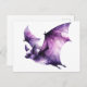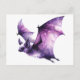 This postcard features watercolor artwork of a bat flying. The nocturnal wild animal is in shades of purple, from dark to light.
