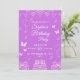 A vibrant and playful birthday invitation featuring a rich purple background with charming balloon, butterfly, and celebration illustrations. Perfect for creating a joyful atmosphere, this fully customizable design allows you to easily edit the name, date, time, and location for a fun and memorable birthday event.