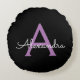 Black and Purple Simple Script Monogram Name Pouf Pillow. The pillow makes the perfect sweet 16 birthday, wedding, bridal shower, baby shower or bachelorette party gift for someone decorating her room in rose gold.