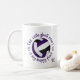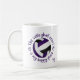 This sporty volleyball team colours coffee mug with monogram features the typographic phrase, "The volleyball court is my happy place" and two heart outlines in purple encircling a volleyball with purple, black and white coloured panels - customise with monogram - by katz_d_zynes