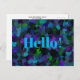 Purple, Blue, Green and Black art began as a photo of a peacock's colourful feathers and transformed into this colourful Hello! postcard.