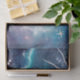 Gas and dust particles swirl around in outer space creating beautifully coloured clouds occupying the space between the stars. Acting as a nursery for new stars, this cloud nebula design is light blue and purple. A white astrological pattern with planets and stars has been added on top