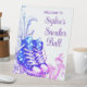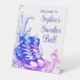 Sneaker ball welcome table sign with pretty purple and blue sneakers and diamonds on a purple and blue swirl background. This sneaker ball welcome sign is easily personalised for your event by simply adding your details.