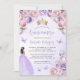 This lovely quinceañera invitation features a border of lilac purple and blush pink roses on a purple watercolor background. A gold tiara, a brunette girl in a purple princess dress and small purple butterflies decorate the text. The word "Quinceañera" and the name of the guest of honour appear in elegant purple handwriting script, with the remaining text in grey sans serif font.