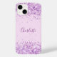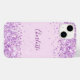 A blush pink background. Decorated with purple faux glitter dust. Personalise and add a name, written with a modern hand lettered style script. Purple coloured letters.