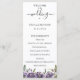 Purple watercolor flowers and green botanical branches, wedding program. Program features cute calligraphy "wedding" accent with multiple lines for custom text lists for ceremony order of events, wedding party and thank you note.
