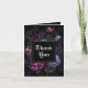 Romantic and moody, this thank you thank you card is the perfect way to thank your guests. The moody floral design features a natural bouquet of purple flowers with a white rose in the centre in a luxurious arrangement on a dark purple and black lace background. The front says "thank you." The inside has a place to add the names of Bride and Groom and a wedding photo.