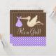 A cute purple and brown girl baby shower invitation. Featuring a stork carrying a purple bundle. Trendy and modern -- Easily personalise for your baby shower!