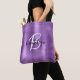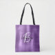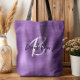 This elegant personalised tote bag features a monogram and first name in modern black and white script on a trendy purple brushed metal background.