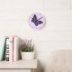 This clock features a beautiful illustration of a purple butterfly on a lilac background colour. The clock face is made of simple and stylish black lines.