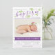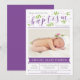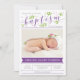 Baptism invitation photo card with elegant calligraphy and foliage design in purple colour.