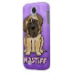 Pretty Purple Mastiff iPhone case for dog lovers! An adorable cartoon of the fawn dog breed sits in the centre, with a fun purple dot background. Below, the breed name is printed in thick pink letters. Very cute English Mastiff gifts.