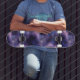 This skateboard design features a background of the galaxy in purple tones.