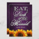 Eat Drink & Be Married purple Chalkboard Sunflower Wedding Invitations---match the RSVP cards and more found below on this page. Compliment your sunflower wedding theme with these invitations that feature a purple chalkboard texture as a background with Eat, Drink & Be Married in elegant script with vibrant sunflowers at the bottom of the front and back of each invitation. These wedding invitations are set to high quality basic card stock; however, you can change the stock to linen, felt (embossed), recycled, and several metallic shades if you would like under number 2 (choose your style, size & paper type) below the orange add to cart button. A list of the additional costs for a fancier card stock are displayed also under that option. Each invitation comes with a fitted white envelope. See matching wedding RSVP cards below to complete the suite.