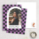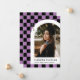 This modern and unique graduation announcement features a lavender purple and black chequered background highlighting a photograph of the graduate framed in a white arch with the graduate's name and school beneath. A small gradation cap is cleverly displayed in the checked background with the graduate's graduation year. The back has a fun matching checked pattern in light purple and black.
