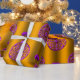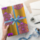 A very decorative and elegant gold Christmas wrapping paper with a pattern of purple Christmas decorations.
