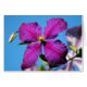 A floral photograph of a bright purple clematis flower against a beautiful blue sky.