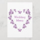 Wedding menu butterfly heart design. Customise this purple coloured menu with your wedding details. Should you require any help with customising then contact us through the link on this page. Purple coloured butterfly heart design personalised wedding menu