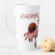 Personalised latte mug with nature design. Big echinacea / coneflowers and bumblebee design. Add a name in printed uppercase letters on one side. A beautiful botanical illustration that features the best of nature, with medicinal herbs and a beneficial pollinator. Colours are red and pink with green.