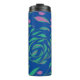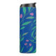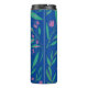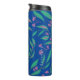 Purple Cypress Botanical Thermal Tumbler features hand drawn leaves and purple flowers with deep see blue background.