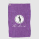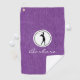 Black silhouette of lady golfer in a round white frame with name, on a purple denim print golf towel. Personalise the name to create a unique golf gift and keepsake. Change text to make it yours using the simple Template provided. Dimensions: 16" x 24", 80% woven polyester/ 20% polyamide blend microfiber, grommet and brass-plated hook included. Machine washable.