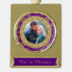 This special holiday keepsake ornament features your own photograph within a frame of gold faux glitter snowflakes on a royal purple background. A second circular frame in a gold ornate pattern makes it unique. The bottom portion has your text in gold on a purple violet background; make it say whatever you'd like! An elegant and festive keepsake gift for any couple.