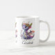 A mug with an illustration of a mythical dragon. Purple and blue scales. A flowered gold crown with horns adorns its head. Magical, fun and friendly.