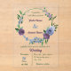 Beautiful romantic wedding acrylic invitation featuring dusty blue and purple flowers and some green leaves .