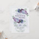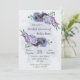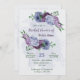 Beautiful romantic bridal shower invitation featuring dusty blue and purple flowers and some green leaves .