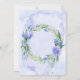 Design features a printed coloured with floral element in shades of purple and dusty blue over greenery leaves branch wreath and peony tulip hyacinths flowers on a light lilac light blue watercolor background.. Great for your wedding celebrations!