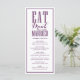 Eat, drink and be married. Complete your event tablescape with this customisable wedding menu card. It features modern calligraphy and classic typography, perfect for any wedding theme. Personalise by adding your details. Matching items are available. This purple menu card is available in other colours.