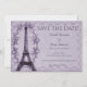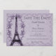 Announce your upcoming wedding day with a Purple Eiffel Tower save the date announcement. Save the Date design features the Eiffel Tower adorned with a fancy flourish frame against a grunge background and postal stamp embellishment. Additional wedding stationery available with this design as well. Need help with customisation? Please contact me and I will work out the wording and details to fit this design to your satisfaction.