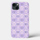 Trippy iPhone case with a weird eye pattern in pastel purple and pink colours. This fun psychedelic pattern resembles retro modern mid-century style due to its geometric shapes.