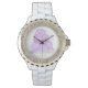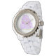 I had two concerns when ordering this watch - one that the watchband didn't look that glittery and two that the dial would be too large. Neither was a problem at all. The watch band is nice and glittery for a touch of bling. As to the size, I have small bones so I tend to like smaller looking accessories and I am quite comfortable with this. Neither too large or too small. The outside edge to edge on the dial is 1 1/4" the inside image is 1 inch.