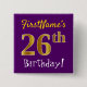 This simple square button design features a message like "FirstName’s 26th Birthday!", with the "26th" having a faux/imitation gold-like colouring look, on a purple coloured background. The name can be personalised. Buttons like these could perhaps be worn by guests at a birthday party for somebody who is celebrating their twenty sixth birthday, where the party is being held in a large area with lots of other people present (such as a city park or a theme park). [~Z0000166]