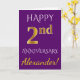 This simple, personalized wedding anniversary greeting card design features the message "HAPPY 2nd ANNIVERSARY", with the "2nd" having a faux gold-like appearance. The front also features a custom name, and a purple colored background. The inside features a custom wedding anniversary greeting message. It could be given to a husband or a wife in celebration of the couple’s second wedding anniversary. [~Z0000089]