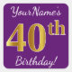 Purple, Faux Gold 40th Birthday + Custom Name Square Sticker