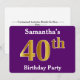 This invitation design features the ordinal number "40th" with a faux gold-like appearance. It also features a personalised name, and a purple coloured background. The event details on the back can be personalised. It could be used to invite people to somebody’s fortieth birthday party. [~Z0000014]