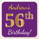 This simple paper coaster design features a message like "Andrew’s 56th Birthday!", with the "56th" having a faux/imitation gold-like colour appearance, on a purple coloured background. The name can be customised. Personalised paper coasters like these could perhaps be used at a birthday party for somebody who is celebrating their fifty sixth birthday. [~Z0000197]
