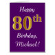 This simple birthday card design features the message "Happy 80th Birthday", with the "80th" having a faux gold-like appearance. It also features a personalised name, and a purple background. It could be given to somebody who is celebrating their eightieth birthday.