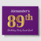 This guest book design features the ordinal number "89th" with a faux/imitation gold-like appearance. It also features a personalised name, and a purple coloured background. It could be used at a party for somebody celebrating their eighty ninth birthday. [~Z0000057]