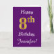 This simple birthday card design features the message "Happy 8th Birthday", with the "8th" having a faux gold-like appearance. It also features a custom name, and a purple background. It could be given to somebody who is celebrating their eighth birthday.