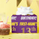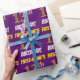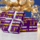 This wrapping paper design features a message like "FIRST-NAME’S 13th BIRTHDAY!", with the "13th" having a faux/imitation gold-like colour appearance, and with the name and "BIRTHDAY" in a fun, bold font. The name can be personalised, and the background is coloured purple. Wrapping paper like this could perhaps be used when wrapping birthday gifts being given to somebody in celebration of their thirteenth birthday. [~Z0000206]