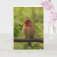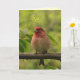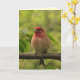 This Father's Day card features a beautiful purple finch sitting high up on a branch, surrounded by green leaves. He has a brilliant red head and a pale pink breast. His sturdy beak is perfect for cracking seeds. He is the bird that the famous ornithologist, Roger Tory Peterson, described as a “sparrow dipped in raspberry juice.” Another chubby little bird is inside. The text can be customised for your special occasion.